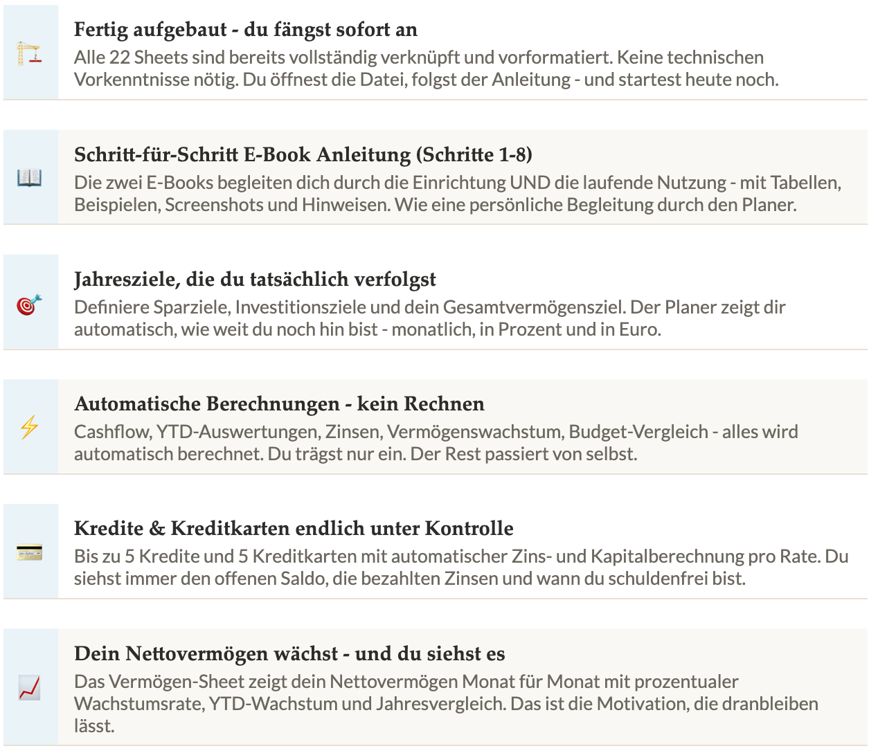 Absolut - und ich sage das nicht einfach so. Der Planer ist so aufgebaut, dass du nur die vorgesehenen Felder ausfüllst. Alles andere berechnet sich automatisch. Die E-Book Anleitungen zeigen dir jeden Schritt mit Beispielen. Du brauchst keinerlei Vorkenntnisse.